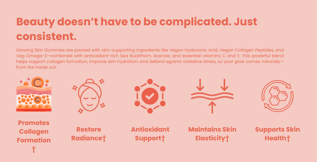 Glow from within, naturally. These apple-flavored vegan gummies are infused with plant-based collagen boosters, hyaluronic acid, and vitamins to help your skin feel hydrated, firm, and radiant—every single day.